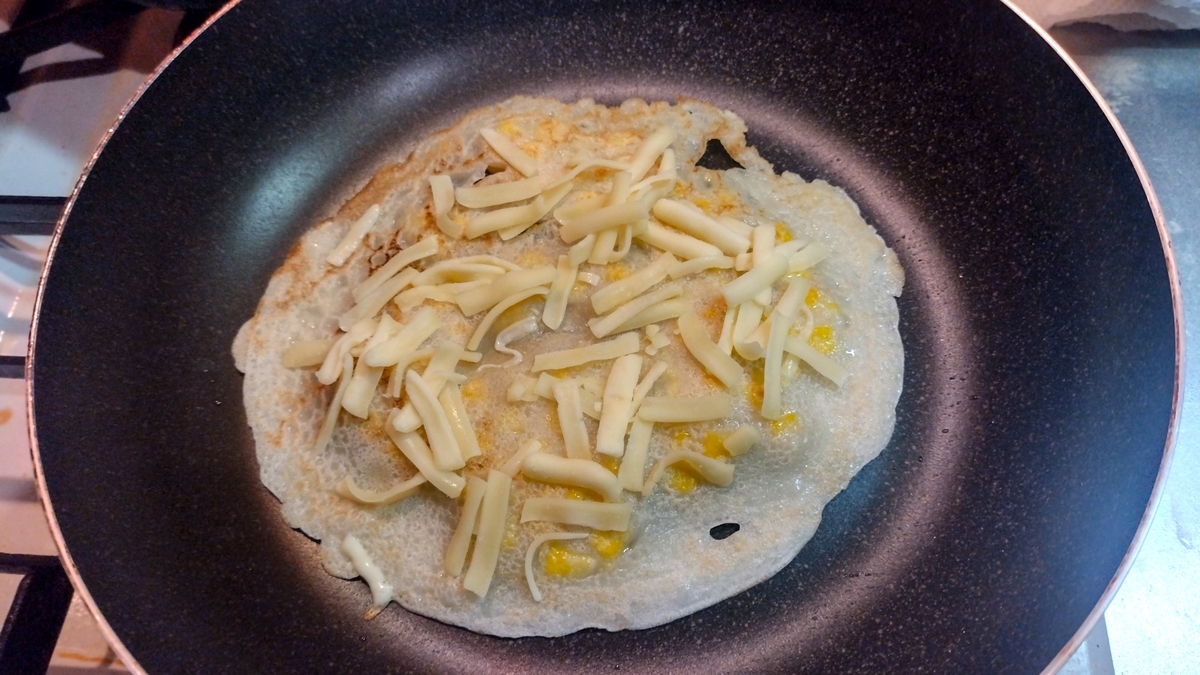生地のフチが茶色になってきたらひっくり返しの合図。ひっくり返したらピザ用チーズを散らす。もう片面も焼きつつチーズを蒸し焼きで溶かすためにフライパンの蓋をして1分放置する。